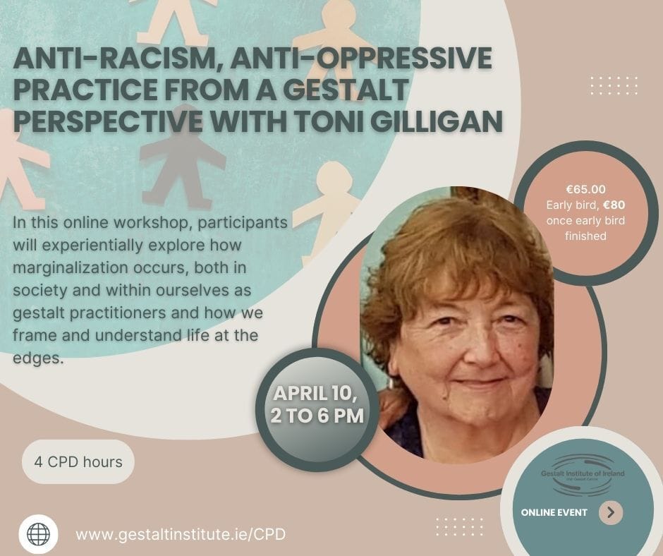 We are excited to offer the upcoming April CPD event with Toni Gilligan who will explore anti racism, anti oppressive practice through a Gestalt Lens.